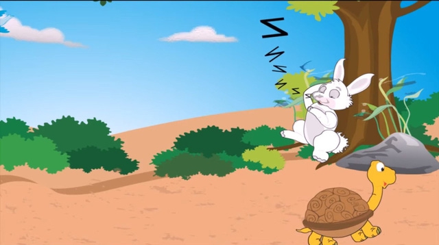 Nghĩ vậy, Thỏ liền nằm nghỉ dưới bóng cây và nhanh chóng ngủ thiếp đi. Rùa từ từ vượt qua Thỏ và nhanh chóng chạy về đích, kết thúc cuộc đua và giành chiến thắng. Thỏ giật mình tỉnh giấc và nhận ra nó đã thua Rùa chậm chạp.